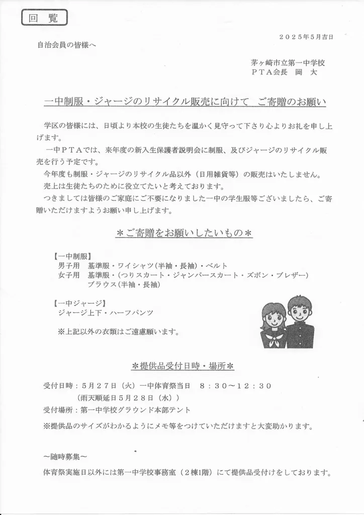 一中制服・ジャージのリサイクル販売に向けて ご寄贈のお願い